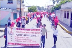 Después de agruparse en un punto acordado, los manifestantes marcharon por la avenida principal del municipio, hasta llegar al inmueble de la Presidencia Municipal, donde fueron recibidos por policías municipales y estatales, y realizaron un mitin pidiendo audiencia con el alcalde y denunciando ante la opinión publica las anomalías de las que han sido objeto, como es el presunto robo de dinero que fue depositado a la Tesorería Municipal como pago de paquetes de lamina que nunca les fueron entregadas.
