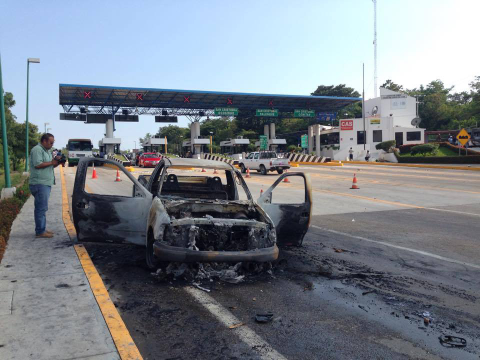 CHIAPA DE CORZO, 12 de noviembre.- Un supuesto grupo de estudiantes que tomaron la caseta de cobro de la carretera federal del tramo Tuxtla Gutiérrez a San Cristóbal de las Casas -a la altura de Chiapa de corzo-, causaron actos vandálicos y quemaron dos vehículos particulares.