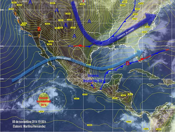 Además indicó que habrá descenso de temperatura en entidades del norte noreste, centro y oriente de la República Mexicana, debido a la asociación del sistema con una masa de aire frío.