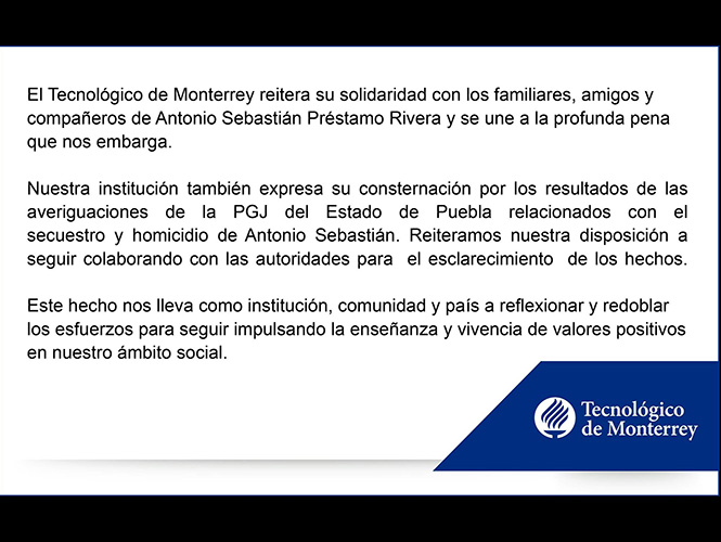 “Nuestra institución también expresa su consternación por los resultados de las averiguaciones de la PGJ del Estado de Puebla relacionados con el secuestro y homicidio de Antonio Sebastián”, subraya l ITESM campus Puebla en el comunicado.