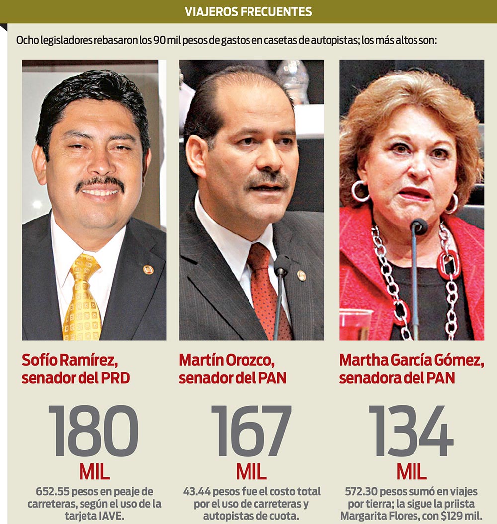 Los 128 senadores de la República gastaron en los últimos dos años cinco millones 182 mil pesos en el peaje de carreteras. Todos aportaron, inclusive los que viven en el Distrito Federal, como Mariana Gómez del Campo, una de los legisladores que más gastó al sumar 108 mil pesos, pero el número uno es el perredista Sofío Ramírez, con 180 mil 562.55 pesos.